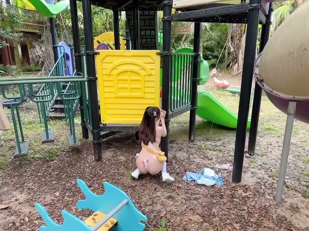 This Japanese petite bikini anal session features a slim, athletic Asian woman fucking herself raw at an outdoor playground. She sits cross-legged on the dirt in a yellow bikini and white knee-high socks, slowly spreading her legs to show off her tight ass. The green slide and yellow play structure behind her create a casual backdrop as she leans forward, lifting one leg before slamming her pussy onto the camera.