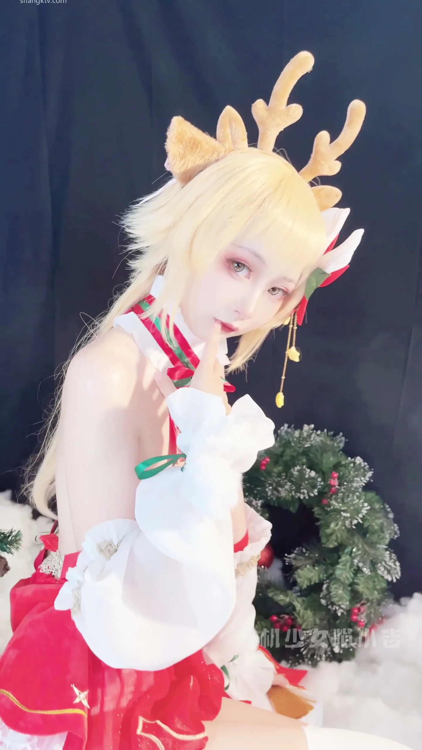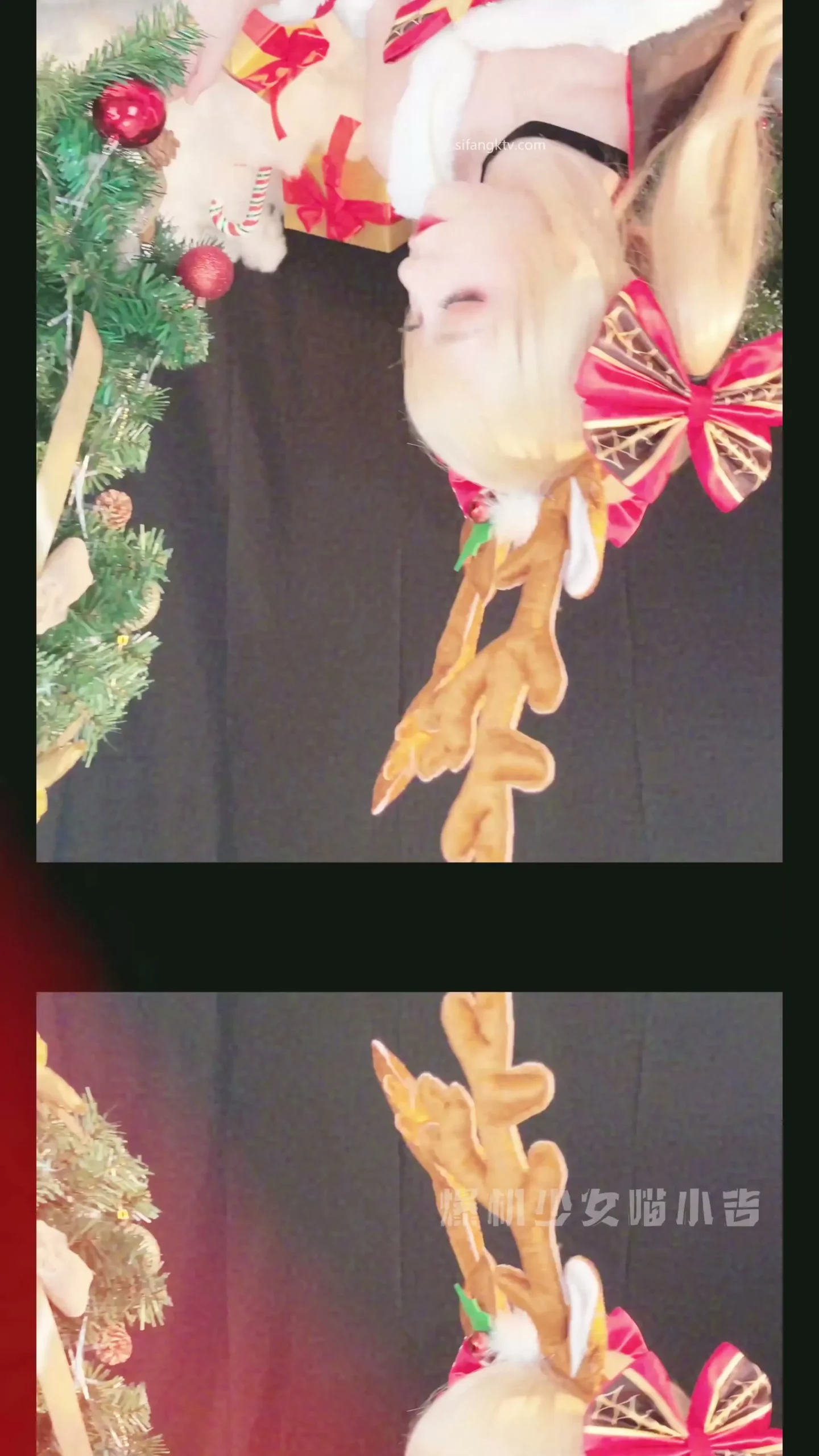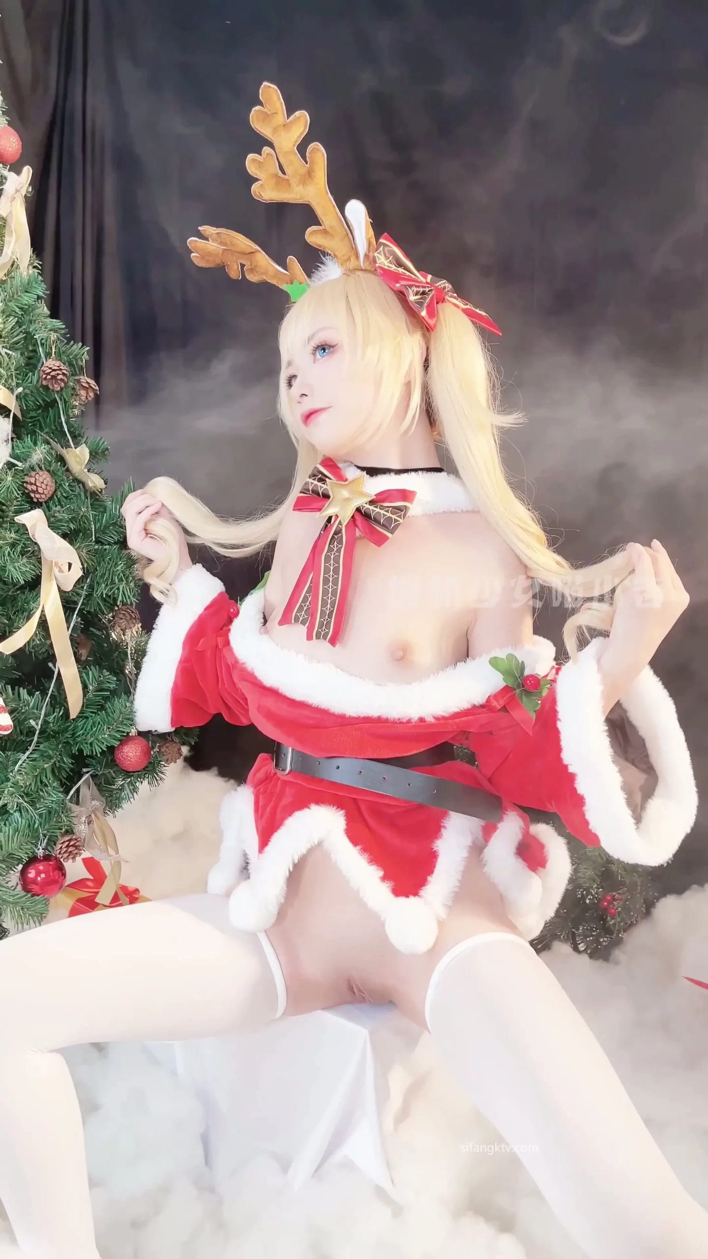 This Japanese petite lingerie dildo session features a slender, light-skinned woman in her 20s or early 30s getting pounded by a vibrator. She’s dressed for Christmas – red outfit with white accents and reindeer antlers – spreading her legs on a soft, snowy indoor surface as she rides the toy hard. Her long blonde twin tails bounce while she playfully interacts with presents before tearing off her Santa-inspired gear to reveal delicate lace lingerie.