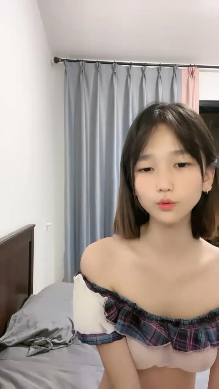 This Japanese petite masturbation session features a slender East Asian girl in her early twenties. She wears a white off-the-shoulder top with ruffled sleeves and slowly removes the straps to expose her hard nipples. The bedroom setting has soft lighting and striped curtains as she spreads her legs, adjusts her position for maximum exposure, and begins fingering herself.