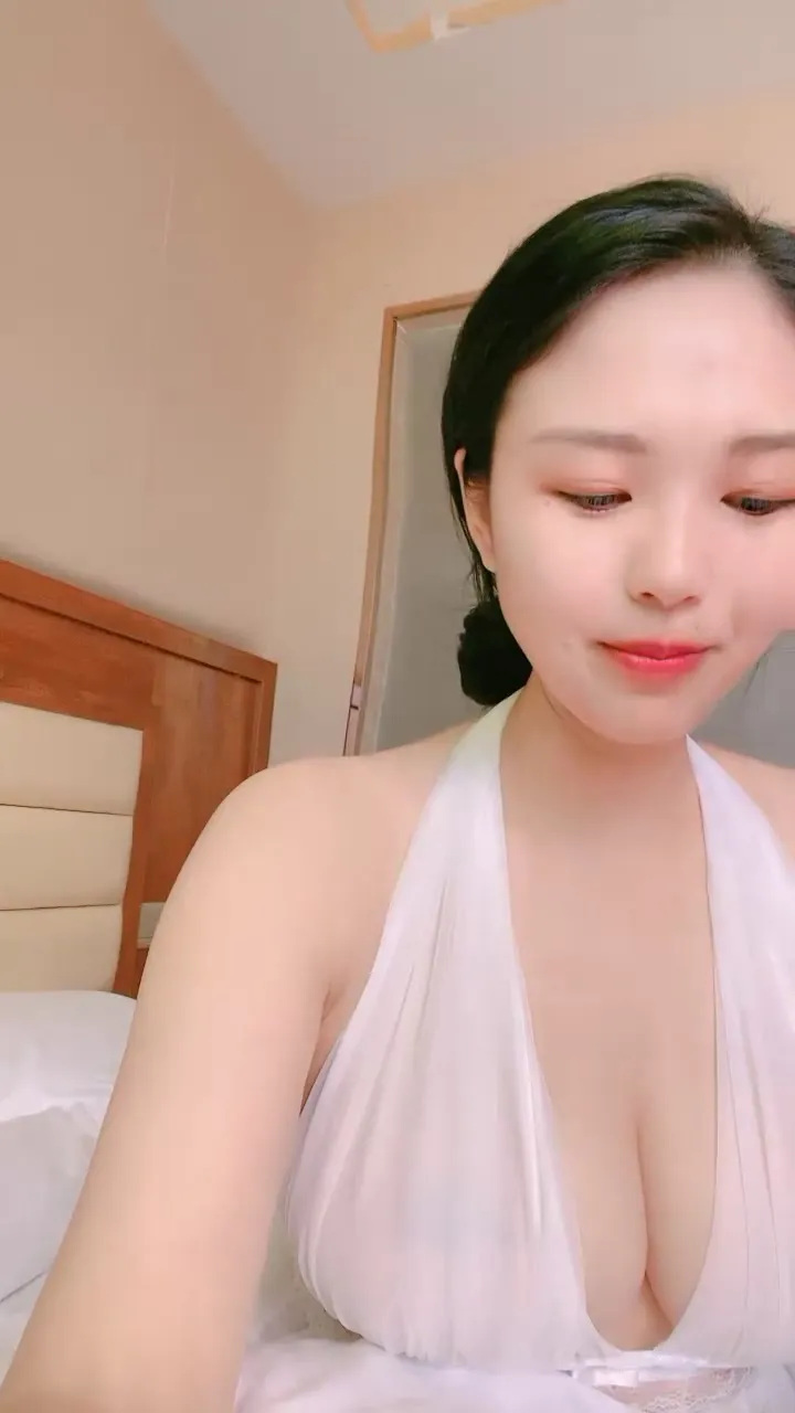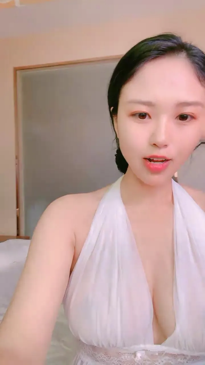 This petite Japanese girl with bangs fucks a pink vibrator hard while lying on her white bed. Her long, dark hair frames her face as she spreads her legs and rides the toy aggressively. She wears a white halter-neck top that barely covers her curves, intensifying the action.