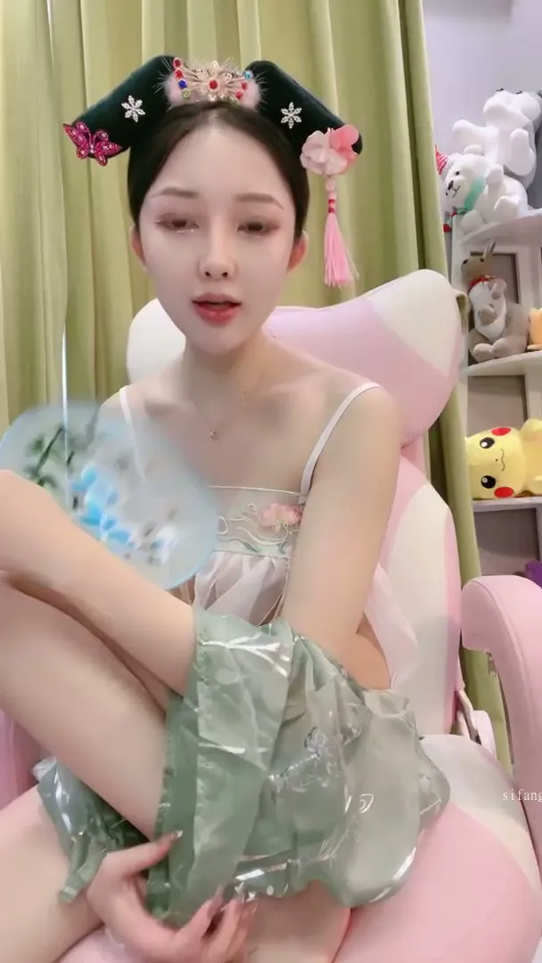 This petite Chinese girl, with long dark hair styled in an updo, slowly undresses and starts riding a dildo solo in her cozy bedroom. She begins in a light green dress with floral embroidery, then removes the skirt to reveal white stockings underneath, before taking off the top completely β exposing her curvy body and black underwear. Sheβs clearly enjoying herself as she spreads her legs and fucks her pussy with the dildo.