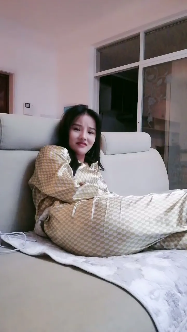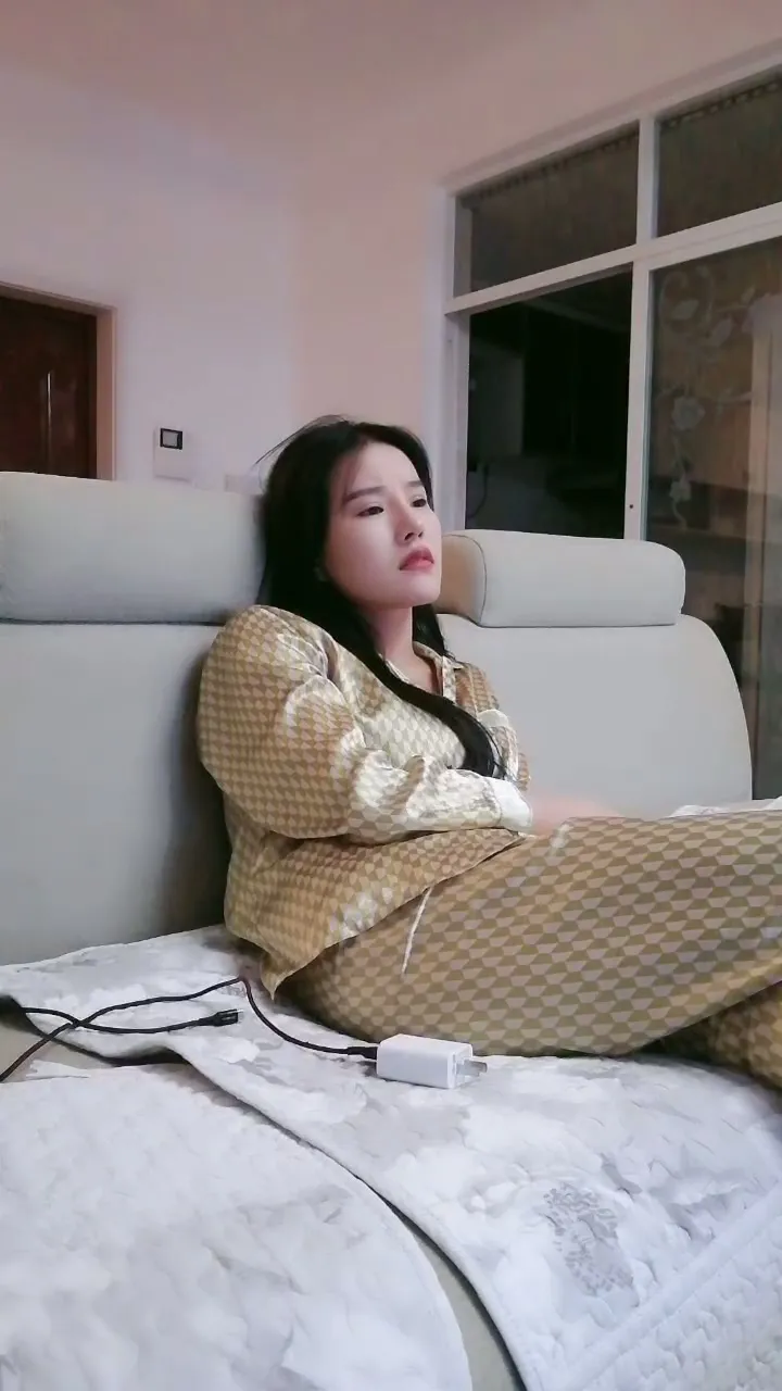 This petite Japanese girl with bangs slowly strips down to nude in her cozy bedroom, starting wrapped in a golden quilt before changing into a shiny gold tracksuit. She rides an exercise bike and sits on the toilet while spreading her legs and exposing her body. The camera captures close-ups of her hands as she caresses herself, revealing every inch of her slender frame.
